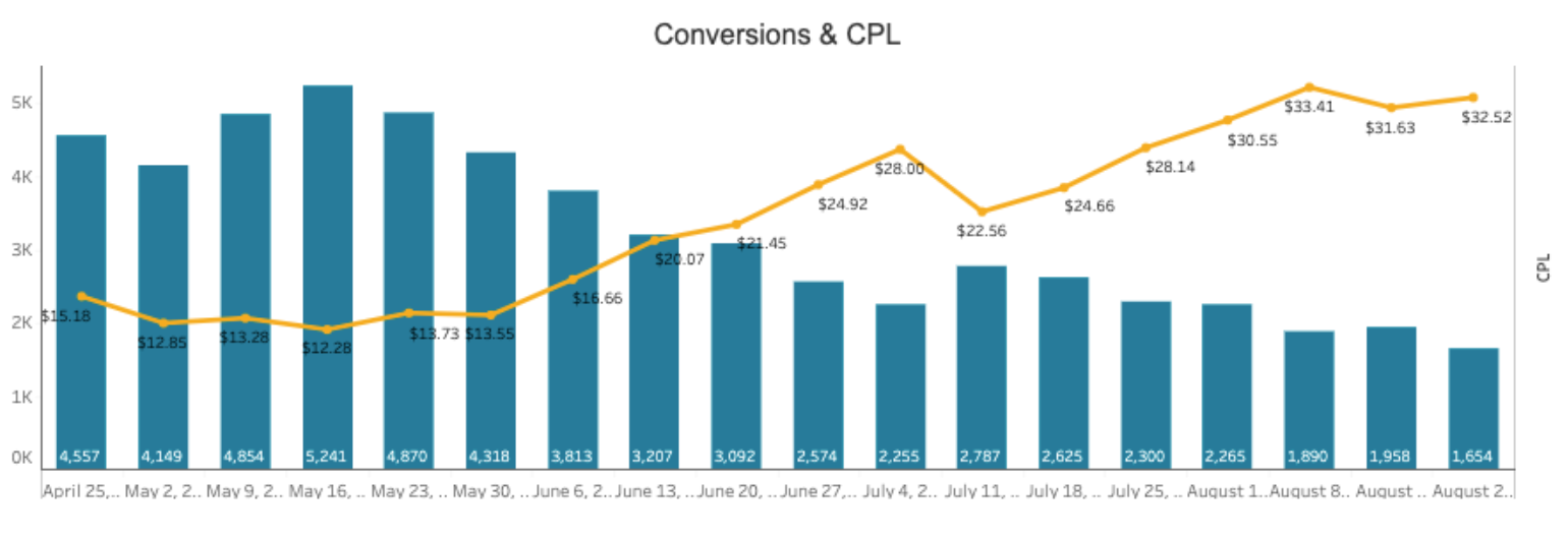 Depicted below is a chart showing lower conversion volume and higher CPLs for campaigns optimized toward a pixel-based conversion because of the iOS 14 update.